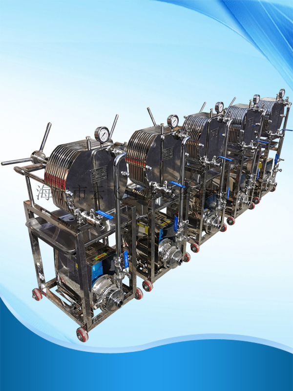 本機為不銹鋼多層板框壓濾機,適用于濃度50%以下粘度較低,含渣量較少的液體作密閉過濾以達到提純,滅菌、澄清等精濾、脫活性碳、除微粒、半精濾的要求,直接選用微孔濾膜,可不經微孔薄膜過濾器過濾可達到無菌過濾之目的)。本機過濾面積大,流量大,適用范圍大,所以在制藥、化工、食品等行業有廣泛用途,應用在制藥廠針劑藥液之過濾,效果甚佳。